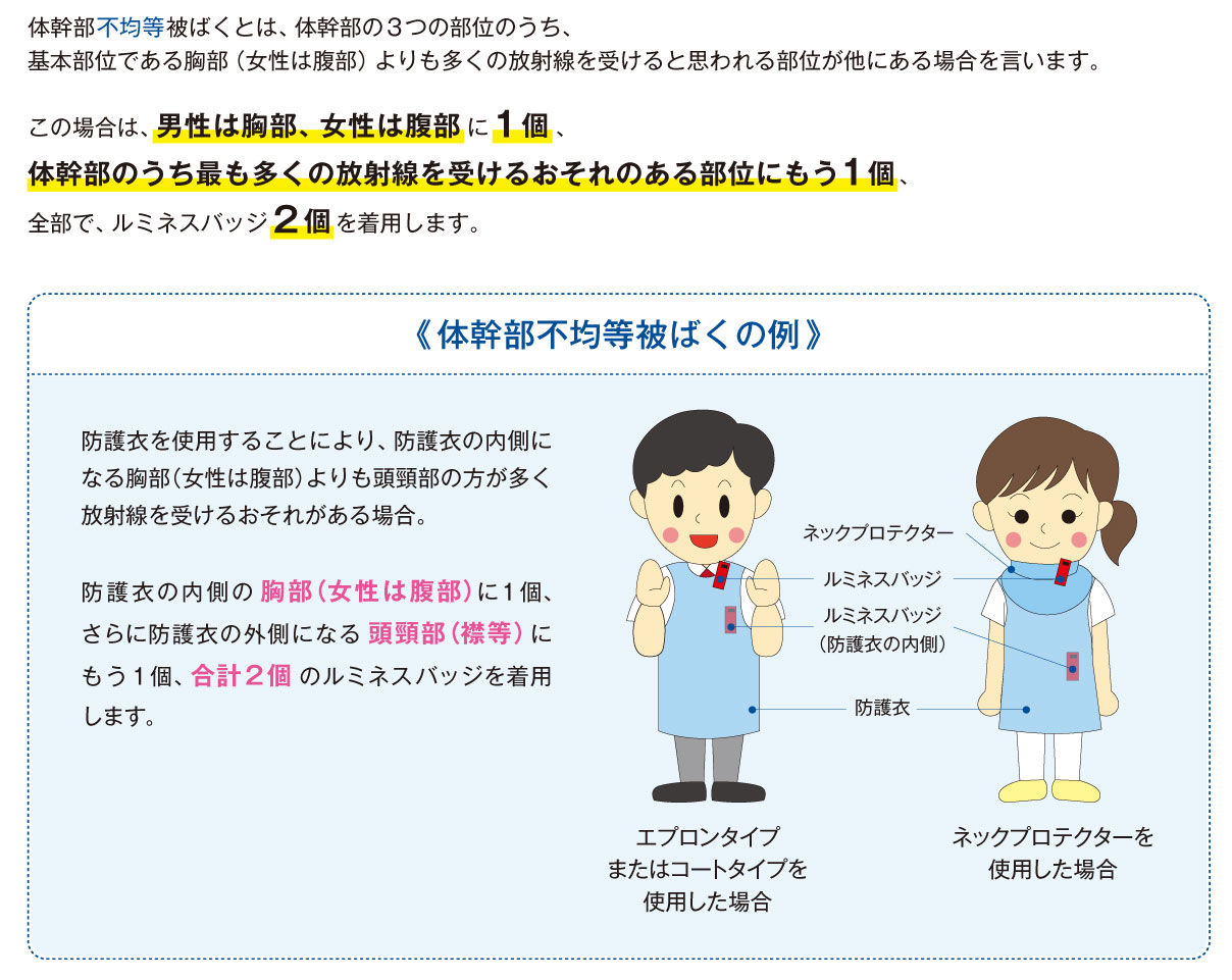 放射線の感受性は臓器や組織毎に異なり、その影響も様々です。性別によりどの部位にバッジを着用したら放射線被ばくに対する影響をより正しく評価できるかを考慮して、着用部位は法令で定められています。